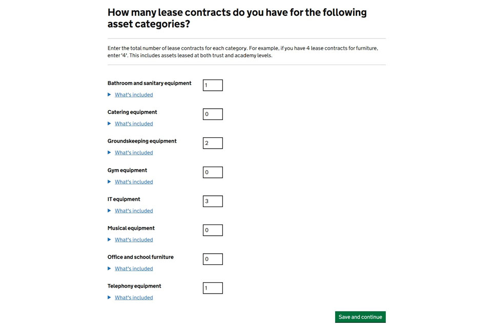 On the non-land and building assets contract page, in response to the question ‘Have you leased any assets that are not land or buildings?’, answer ‘Yes’ and complete the next section, which asks, ‘How many lease contracts do you have for the following asset categories?’